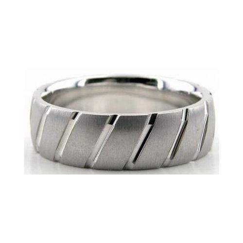 Our jewelers and craftsmen design each wedding band to be one of a kind, and to look amazing. This exquisite ring is dome shaped with a satin finish along with bright cuts going across the wedding and on an angle.
