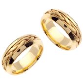 These beautiful hand made designer wedding bands set features a center braid design, and smooth, shiny edges all in yellow gold.