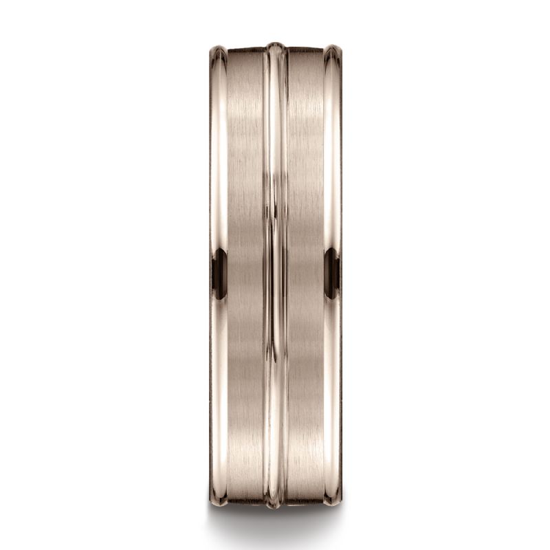 14k Rose Gold 7mm Comfort-Fit Satin-Finished High Polished Center Trim and Round Edge Carved Design Band
