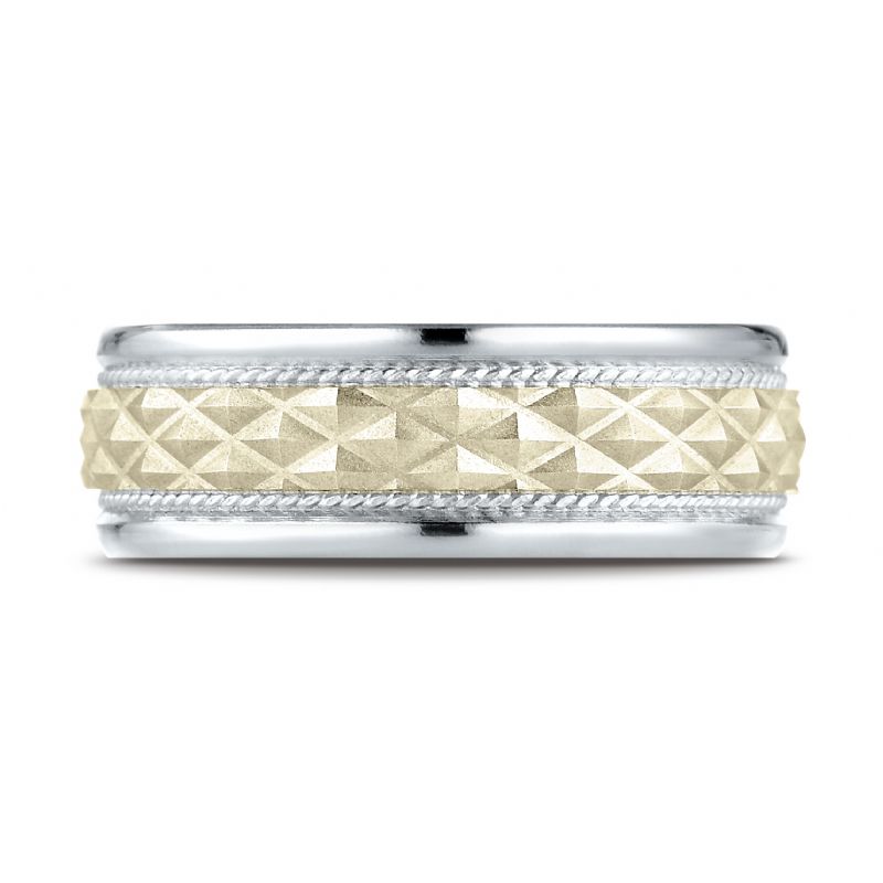 14K Two Tone 8mm Comfort Fit Round Edge Cross HatchPatterned Band