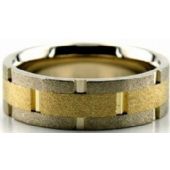 This beautiful hand made designer band contains both yellow and white gold. The center of the band is done in yellow gold, with the rest of the band in white gold. After all the cuts are applied this band is then applied with a sandstone finish giving it its speckled look.