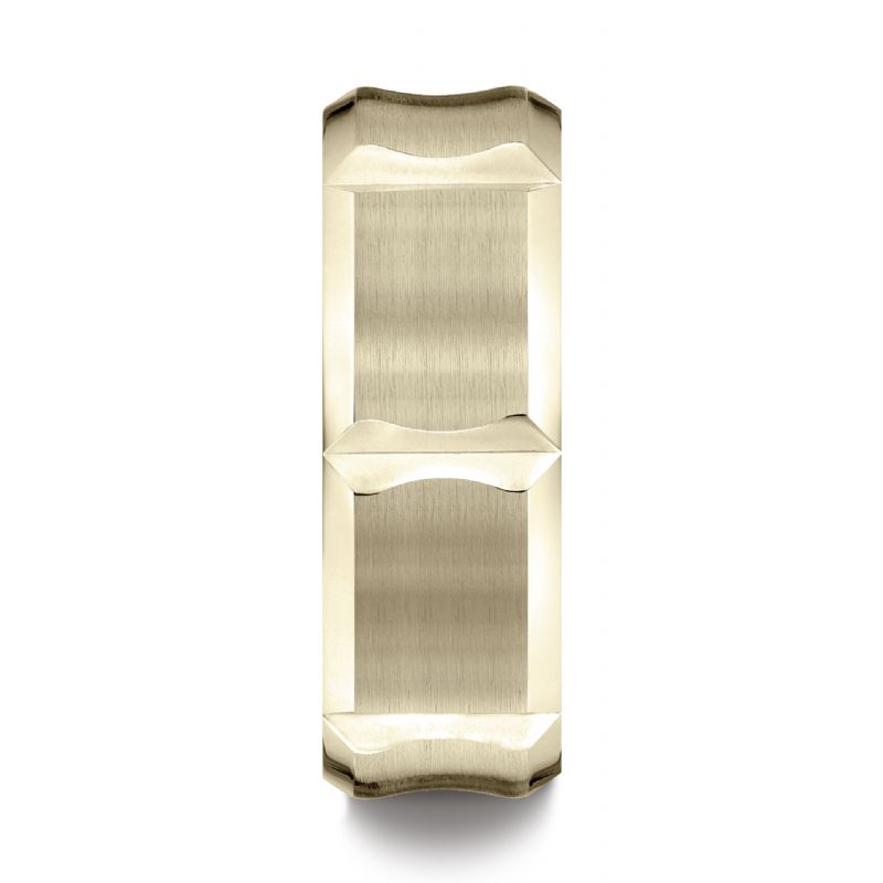 18k Yellow Gold 8mm Comfort-Fit Satin-Finished Beveled Edge Concave with Horizontal Cuts Carved Design Band