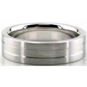 The ring is flat and satin finish, and it has two thin bright cuts going parallel to the ring.